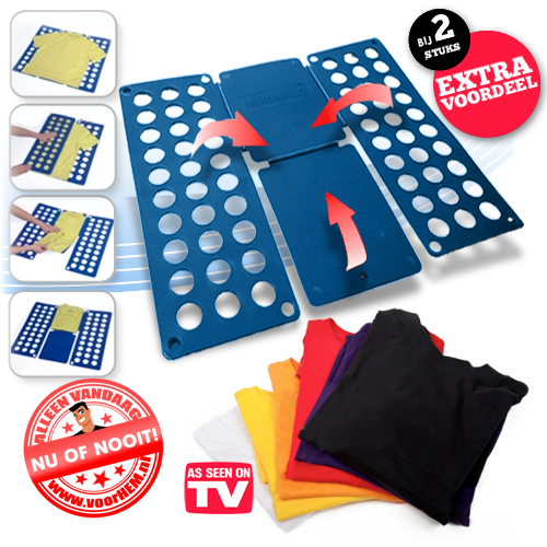 Ben jij niet zo'n held als het aankomt op het vouwen van kleren? De aanbieding van vandaag zorgt ervoor dat jouw kledingkast er voortaan pico bello uitziet! Met de kleding vouwhulp wordt kleding opvouwen vanaf nu een koud kunstje! Deze innovatie kleding vouwplank vouwt in slechts enkele seconden jouw kleding in exact hetzelfde formaat op. Kleding opvouwen was nog nooit zo leuk en je kledingkast was nog nooit zo overzichtelijk! Geschikt voor allerlei kledingstukken (bijvoorbeeld T-shirts, truien en handdoeken) en voor volwassen- en kinderkleding. Zoals je ziet is 1 kleding vouwhulp vandaag al goedkoop, maar bij het kopen van 2 stuks krijg je zelfs extra voordeel!