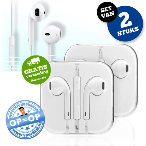 Jawel, om dit grauwe weekje een beetje op te fleuren, vandaag een knal-deal! Niet 1, maar 2 stuks earphones voor een schamel prijsje. Zo'n knaldeal.. Dat betekent natuurlijk wel dat je er écht op tijd bij moet zijn. Op is namelijk echt op. Deze witte Apple look-a-like earphones met microfoon zijn voorzien van een volumeregelaar en hebben een lengte van 110 cm. Naast deze feitjes is er vandaag nog een erg leuke bijkomstigheid: ze worden gratis verzonden binnen Nederland! Dus beter bestel je ze gauw, want je weet zelf hoe het met die dingen gaat. Je bent ze kwijt, hebben hun beste tijd gehad, of liggen thuis, in je tas, in je auto.. In elk geval: nét die plaats waar jij nÃet bent. Een paar extra setjes kan dus nooit kwaad!