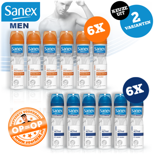 Met Kerst en Oud & Nieuw voor de deur zul je waarschijnlijk ook wel diverse familiebezoeken en andere verplichte gelegenheden moeten ondergaan. Het is niet anders! Levert dat bij jou ook de nodige zweetplekken op? Alleen al bij de gedachte? Terwijl je als goed verzorgde man gewoon netjes en fris voor de dag wilt komen, toch? Stop met peentjes zweten en maak je keus uit 6 (!) stuks Sanex Invisible of Active deodorant sprays. Sanex is al jarenlang vooraanstaand in de zweetbestrijdingsbusiness en daarom 100% te vertrouwen gedurende alle 24 uren van de dag. Scoor deze deo's nu voor een spotprijs zodat jij voorlopig vooruit kan met lekker frisse oksels!