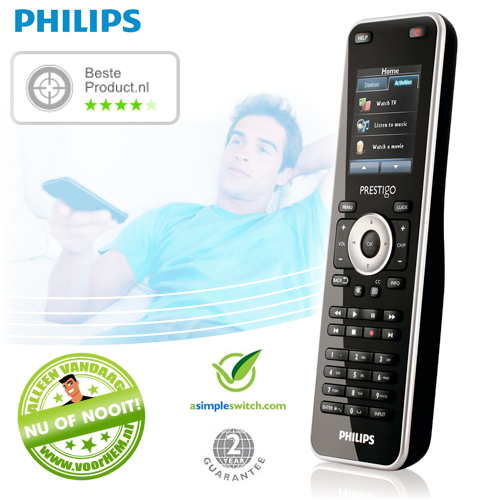 Chillen op de bank is toch wel een van de heerlijkste dingen die er is. Vooral in het weekend. De Philips Prestigo SRT8215/10 gaat dit genieten nóg aangenamer maken. Deze afstandsbediening van Philips is namelijk aan te sluiten op 15 apparaten! Dat lees je helemaal goed, vijftien stuks. Het LCD touchscreen van 5,6 cm maakt bediening van je apparaten gemakkelijker dan ooit en door de verlichte knoppen ondervind je zelfs in het donker geen problemen. Met deze Philips haal je zó veel gemak in huis, dat je 'm voor deze prijs niet voorbij kunt laten gaan. De voorraad is beperkt, dus schakel direct over tot actie!