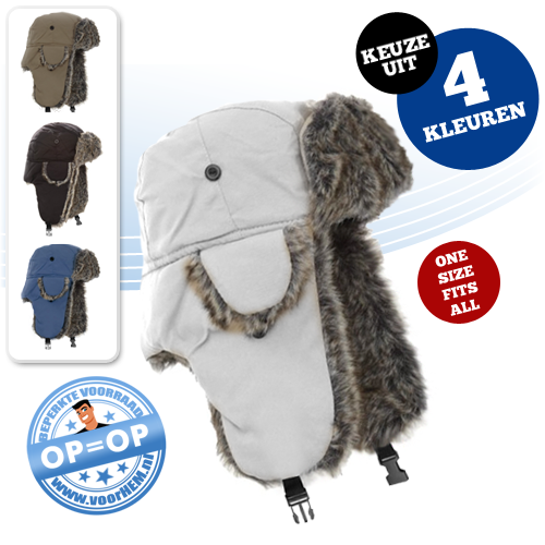 Het is zo ver jongens, het is toch nog bést wel koud geworden. Dachten we de dans te ontspringen deze winter? Mooi niet! Maar goed, die min-temperaturen hoeven allemaal niet zo erg te zijn, als je maar lekker warm gekleed op pad gaat! Deze stoere muts is een heel goed begin. Gewoon zo'n gave Russische muts met oorflappen en een stoere bontrand op je voorhoofd. Geen echt bont uiteraard, want ook nepbond kunnen ze goed zacht en warm maken tegenwoordig. De lekker warme flappen van deze muts zijn ook naar achteren of omhoog te vouwen en daar vast te zetten met een kliksluiting. De muts is alleen vandaag verkrijgbaar en er is voor ieder wat wils. Neem je navy, bruin, wit of zwart? Kies snel, want op is op, en het is nu toch echt koud!