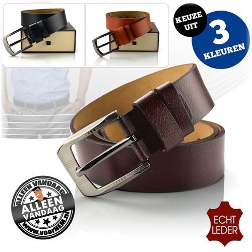 Dat we in zware economische tijden de broekriem moeten aantrekken, daar kunnen we niet omheen. Feit is, dat je dan wel een goede riem nodig hebt! En als het niet alleen goede, maar ook stijlvolle en mooie riem is, is het helemaal geweldig. De riem die je vandaag op voorHEM.nl vindt is beschikbaar in 3 verschillende kleuren; camel, bruin en zwart. Voor ieder wat wils! Daarnaast wordt de riem geleverd in een mooie geschenkbox, zodat je 'm ook met een gerust hart iemand cadeau kan doen. Laat je verbazen door de prijs van vandaag en profiteer er van. Want zodra de klok 00.00 uur slaat, ben je hartstikke te laat!