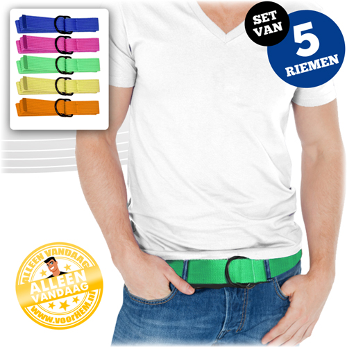 Broeken zijn niet gemaakt om halverwege je billen of op je knieën te hangen. Sommigen maken er wel op die manier gebruik van, maar nee, geen enkele ontwerper heeft het zo bedoeld. Om die reden is een riem soms essentieel. Niet alleen voor het nut, maar ook als sieraad voor je outfit geldt de riem in het hedendaagse leven. Met deze te gekke en kleurrijke deal van vandaag haal je niet 1 riem in huis, maar gewoon meteen 5! Een blauwe, een roze, een groene, een gele en natuurlijk de oer-Hollandse kleur oranje. Met deze set kun je eigenlijk elke outfit opfleuren en afmaken. De riem is voorzien van een dubbele ring buckle en dus in elke maat te dragen. Scoor de set snel, dan heb je de riemen binnen elkele dagen in huis!